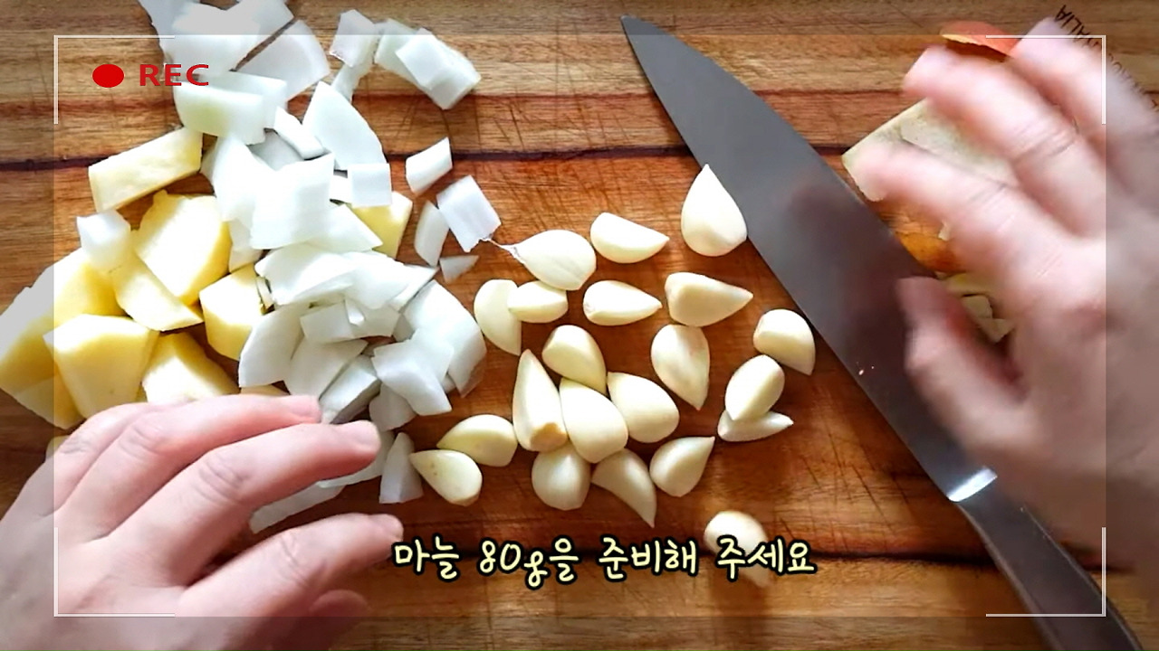양파도 믹서기에 잘 갈릴 수 있도록 작게 썰어주시고, 마늘 80g도 함께 넣어주세요.