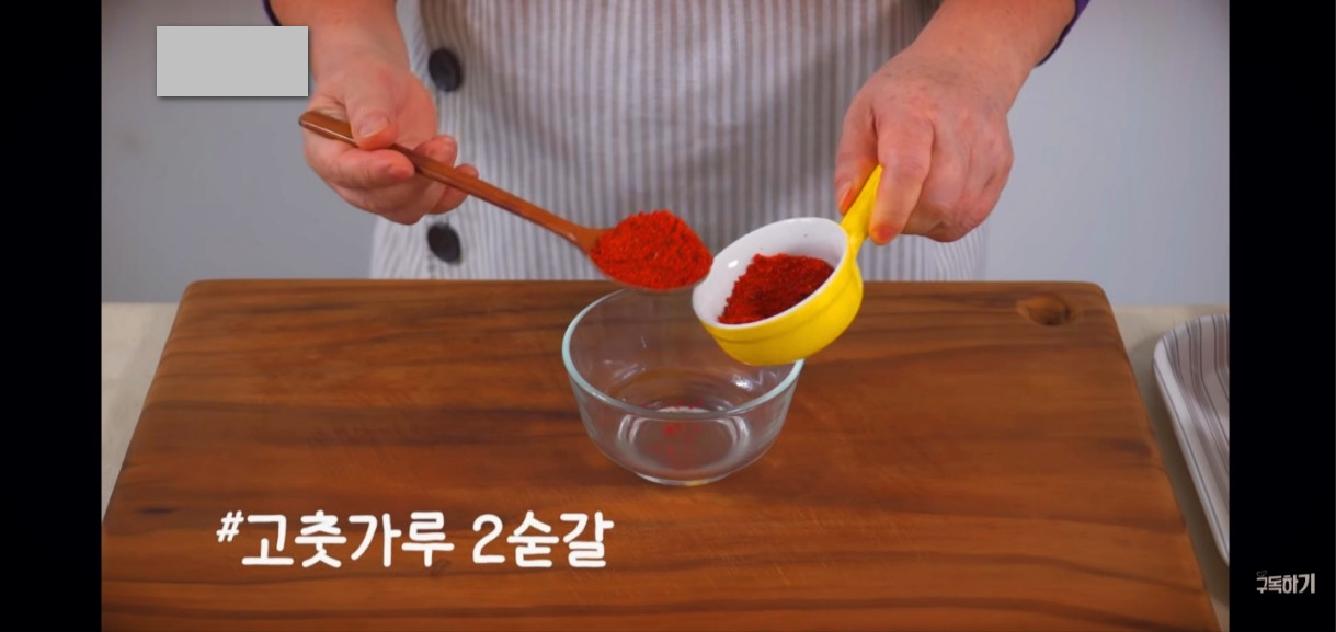 고등어 무조림 황금레시피의 양념을 만들어 볼게요. 먼저 고추가루 2스푼과 다진 마늘 한 스푼을 넣어 주세요.
