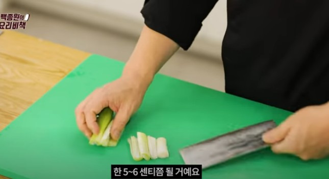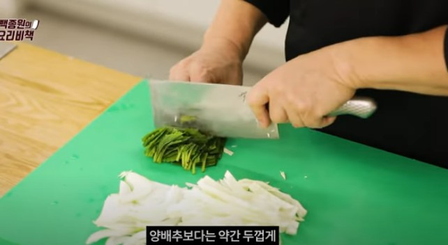 ▶ 대파는 반으로 갈라 5~6cm 길이로 썰고, 양배추와 양파는 비슷한 두께로 썰어주세요.
