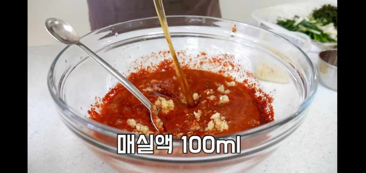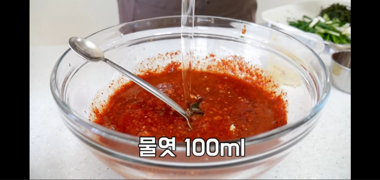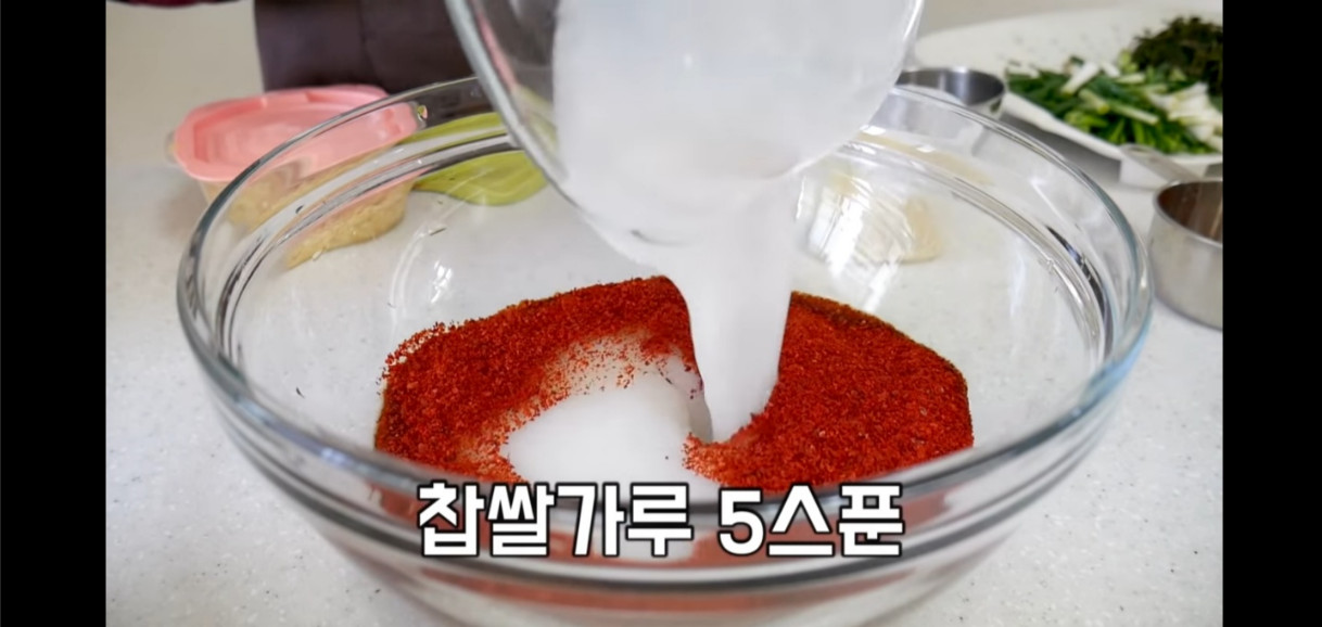 고추가루 10스푼을 넣어 칼칼하고 매콤한 맛을 내주세요. 그다음, 찹쌀풀 5스푼을 넣어 적당히 끈끈한 양념을 만들어줍니다. (찹쌀풀 레시피: 찹쌀가루 5스푼과 물 2컵을 섞어 끓여주세요.)