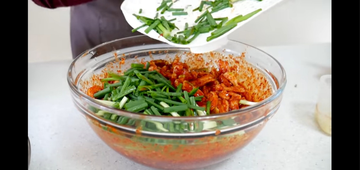 이제 본격적으로 무말랭이무침 만드는 법을 살펴보겠습니다. 만들어둔 양념장에 불린 말린 무를 넣고, 썰어둔 쪽파를 함께 넣어주세요.