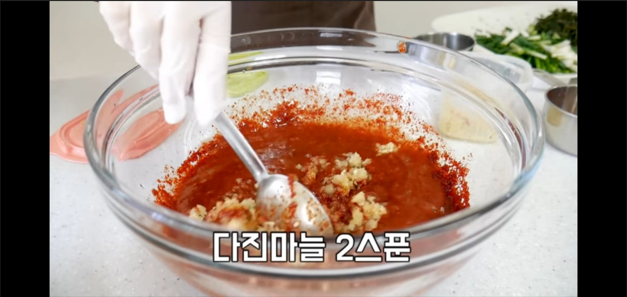 이제 다진 생강 반 스푼과 다진 마늘 두 스푼을 넣어 무말랭이무침에 마늘 특유의 알싸한 향을 더해주세요.