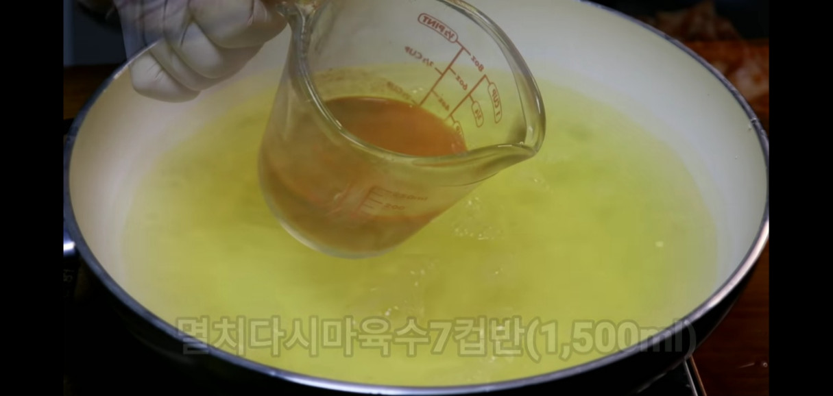 본격적으로 콩나물국 맛있게 끓이는 법을 살펴보기 전에, 먼저 김치를 익혀줍니다. 멸치다시마육수 1.5L를 냄비에 넣고 중불로 올려주세요.