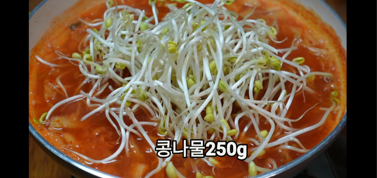 이제 본격적으로 콩나물국 맛있게 끓이는 법을 살펴볼 차례입니다. 잘 익은 김치국에 콩나물 250g을 넣어주세요. 너무 오래 끓이지 말고, 콩나물 특유의 비린내가 사라질 때까지만 잠시 끓여주면 됩니다. 콩나물을 너무 오래 끓이면 아삭한 식감이 없어지니 주의해주세요!