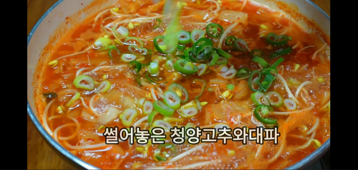 콩나물 비린내가 사라졌다면, 썰어둔 대파와 청양고추, 후추를 약간 넣고 1분 정도만 더 끓여 마무리해주세요.