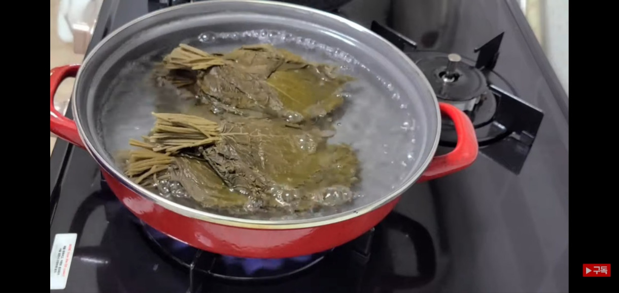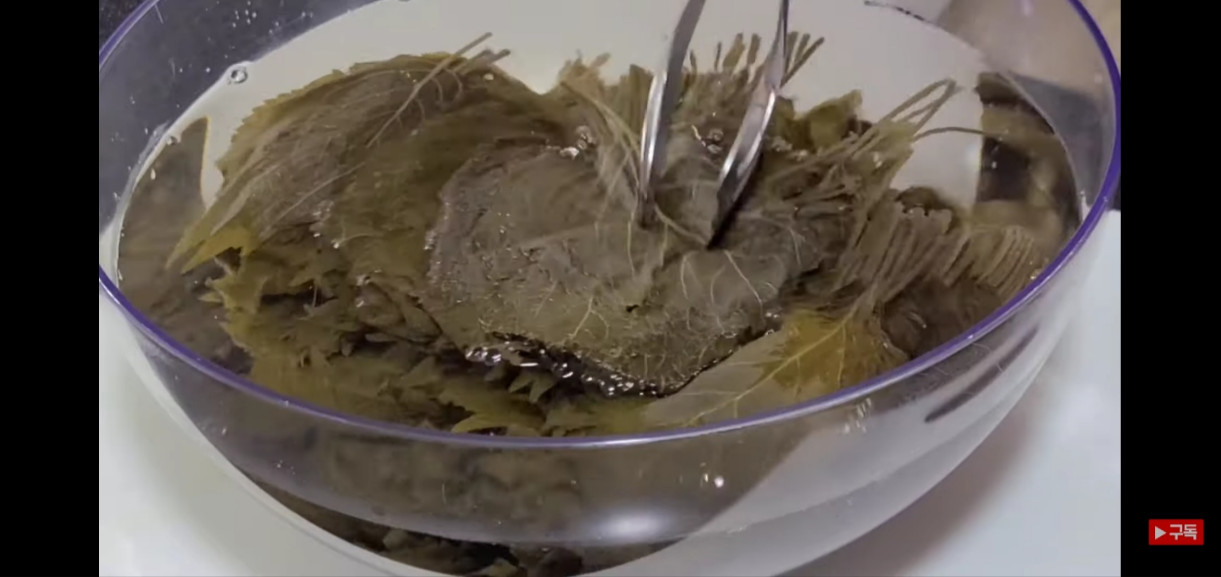 깻잎김치 맛있게 담그는 법에 사용할 깻잎을 손질해보겠습니다. 소금물에 일주일 정도 삭힌 깻잎을 끓는 물에 10분간 데쳐주세요. 이렇게 하면 더욱 야들야들해져서 밥이랑 먹기 딱 좋은 식감으로 변신합니다!