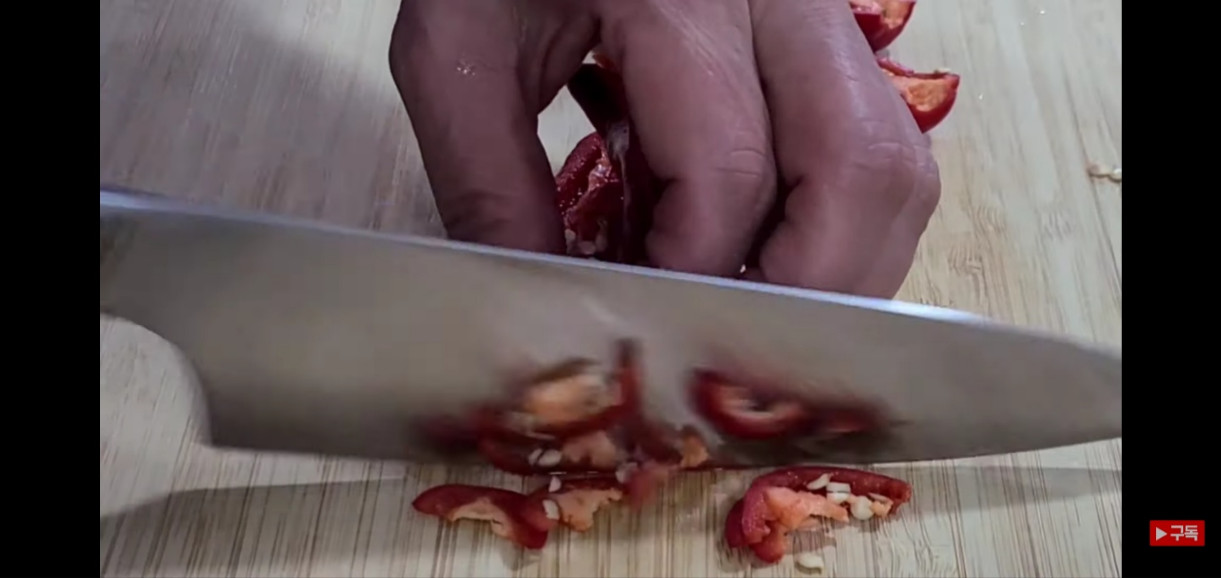 홍고추 2개도 반으로 갈라 잘게 썰어주면, 깻잎김치 맛있게 담그는 법에 필요한 재료 손질이 모두 끝납니다.