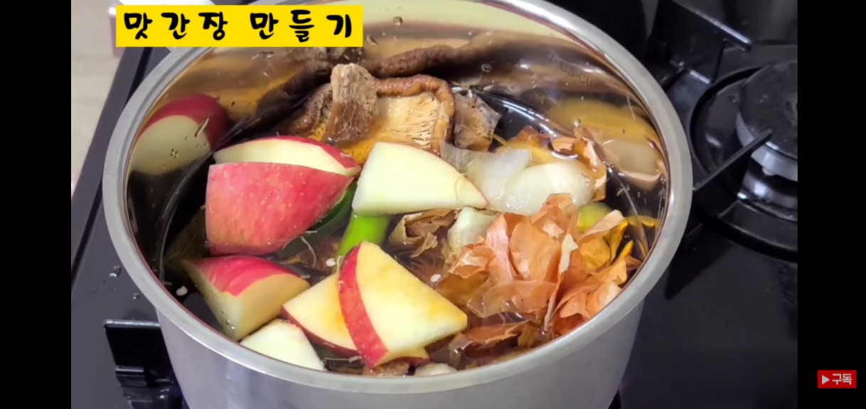 이 상태로 중불에서 끓이면서 국물이 반으로 줄어들 때까지 잘 저어가며 졸여준 뒤, 건더기는 건져내고 맛간장을 식혀주세요.