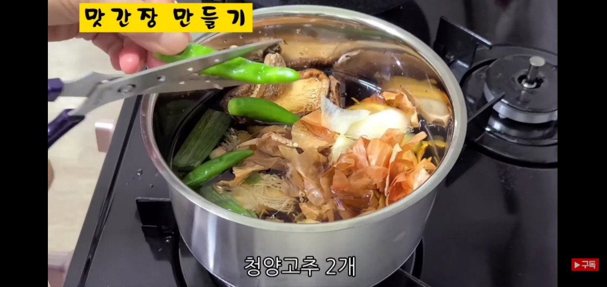 양파 한 개는 껍질째 넣어주고, 알싸한 향이 나는 청양고추를 반으로 갈라서 2개 넣어주세요.