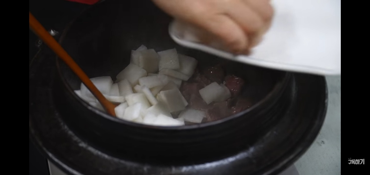 볶는 중간에 맛술 3스푼을 넣어주시고, 어느 정도 색이 나면 썰어둔 무와 양파를 넣어주세요.