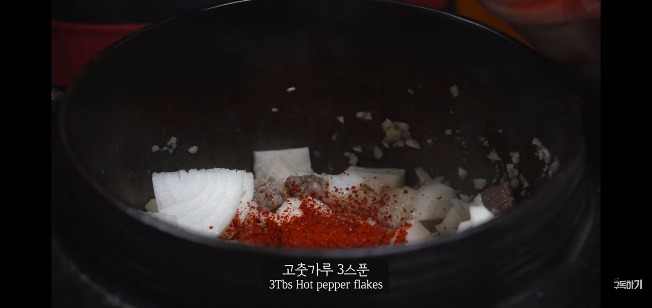 고추가루 3스푼을 넣어 육개장에 칼칼한 맛을 더해주시고, 더 진한 맛을 원하시면 고추기름 한 스푼을 넣어주시면 좋습니다.