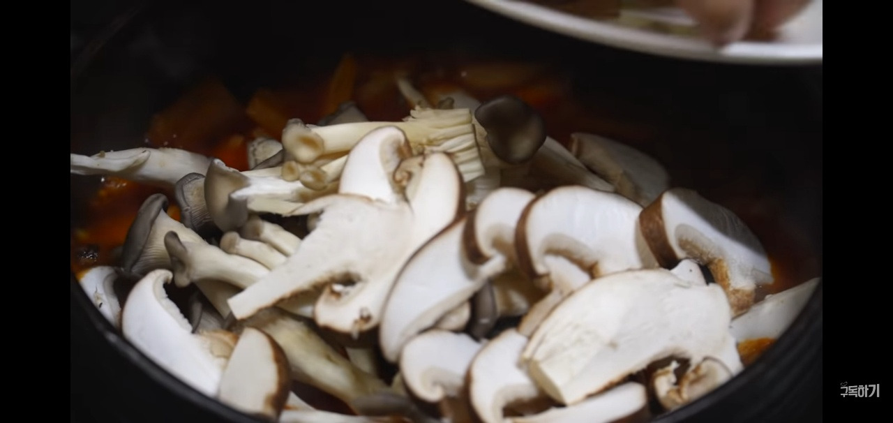고사리와 느타리버섯, 표고버섯을 넣고 5분간 끓여주세요.