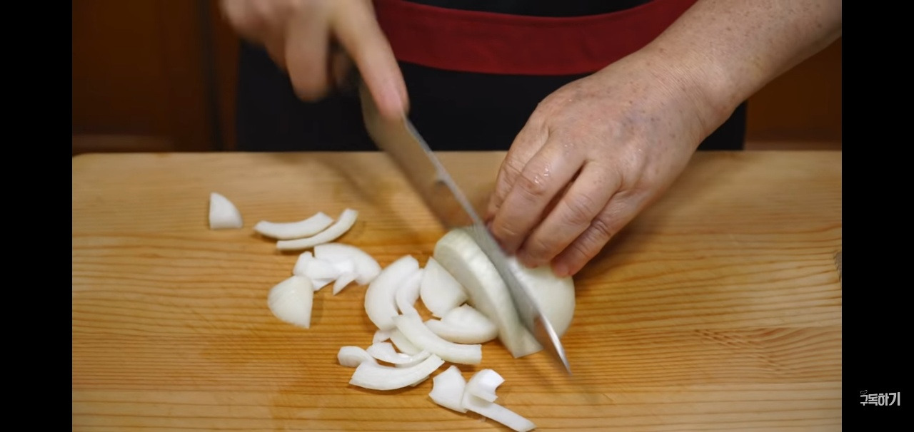 이제 육개장 맛있게 끓이는 법에 들어갈 재료를 손질해 보겠습니다. 무 1/4개와 양파는 숟가락으로 떠먹기 좋은 작은 크기로 썰어주세요.