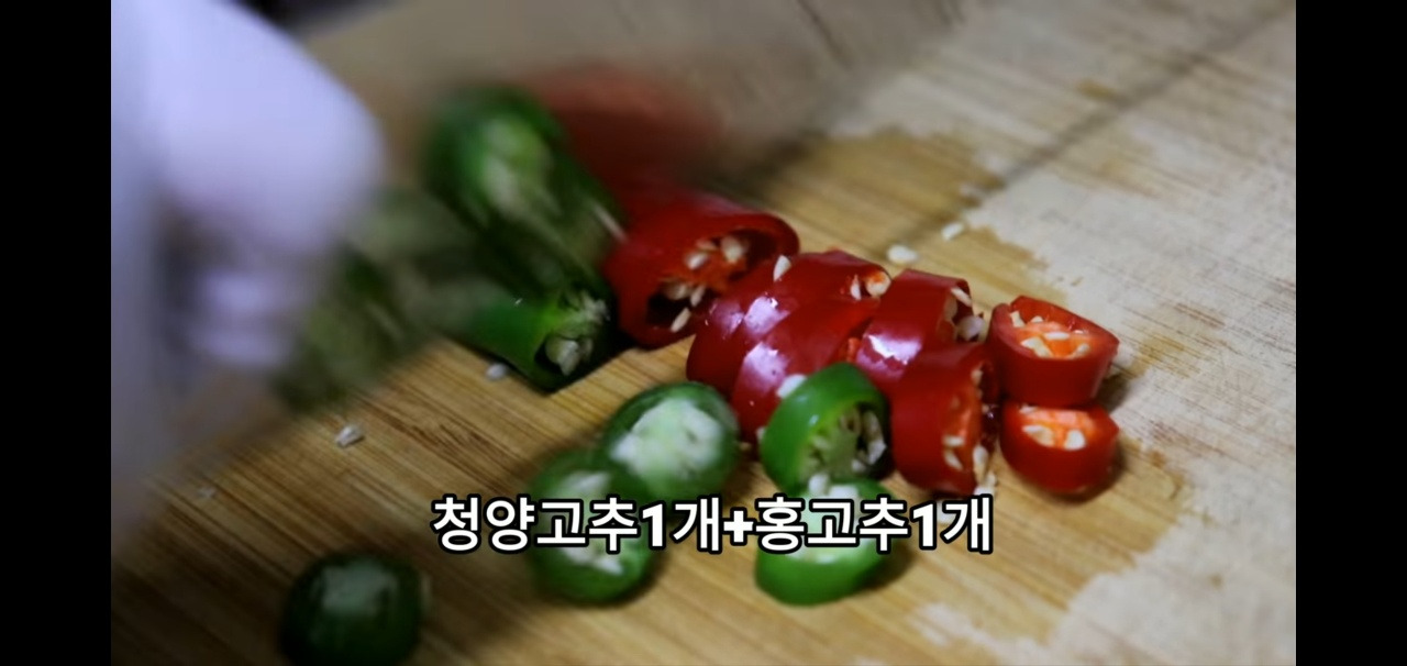 두부 200g도 적당한 크기로 잘라주시고, 청국장에 알싸한 향을 더해줄 청양고추 한 개와 홍고추 한 개도 작게 썰어주세요.