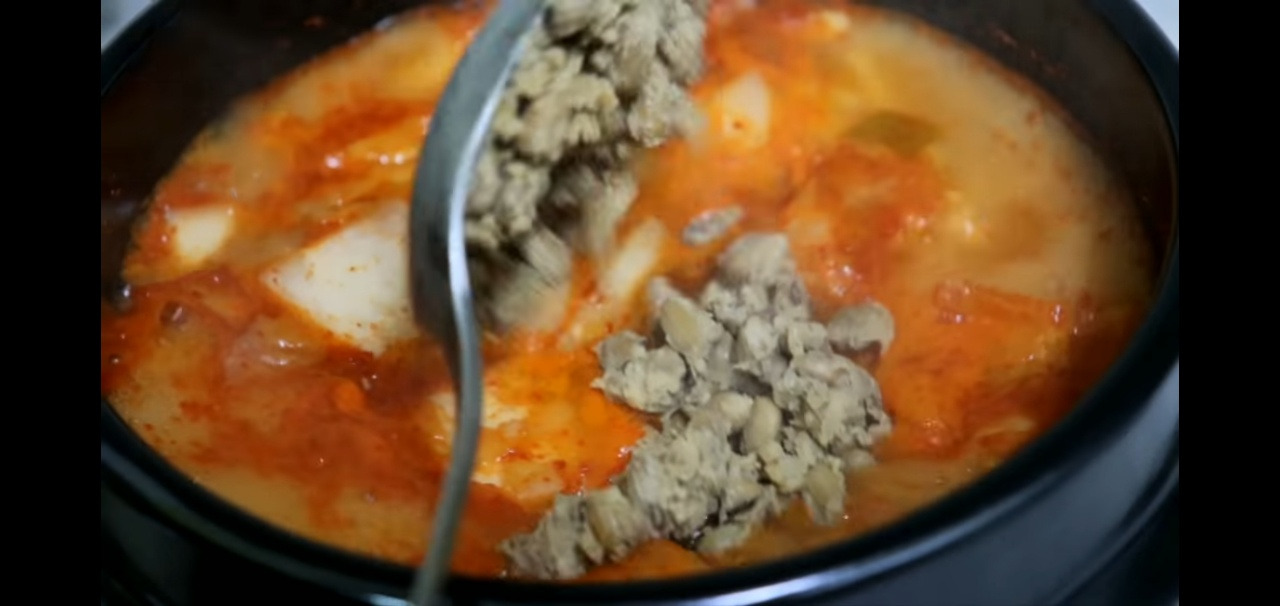 김치를 넣고 5분 정도 끓인 뒤, 고추가루 2스푼과 청국장을 넣고 중불에서 5분 더 끓여주세요.