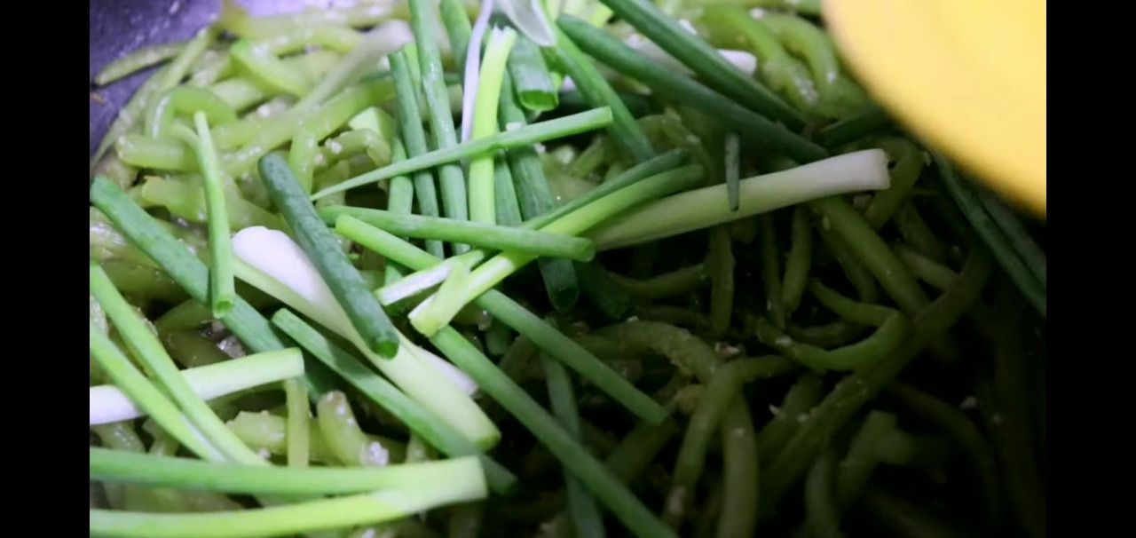 마늘과 대파의 향이 올라오고 대파가 어느 정도 익으면, 양념해 둔 고구마줄기를 넣어 주세요.