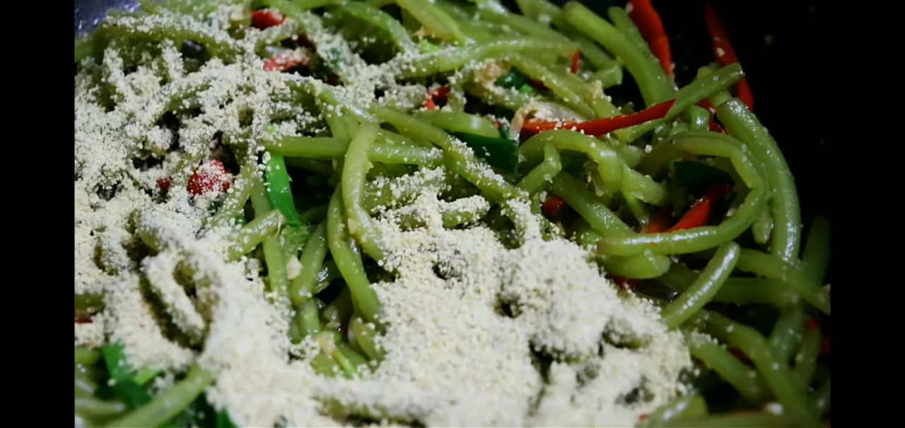 고구마줄기볶음 황금레시피의 핵심 재료인 들깨가루를 듬뿍 2스푼 정도 넣어 주세요. 고소한 맛을 한층 더 끌어올려 줍니다!