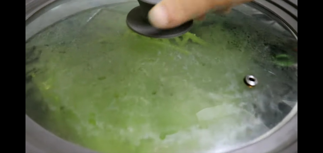 고구마줄기를 넣은 후 졸이기 위해 생수 5스푼을 넣고, 냄비 뚜껑을 덮은 채로 잠시 졸여 주세요.