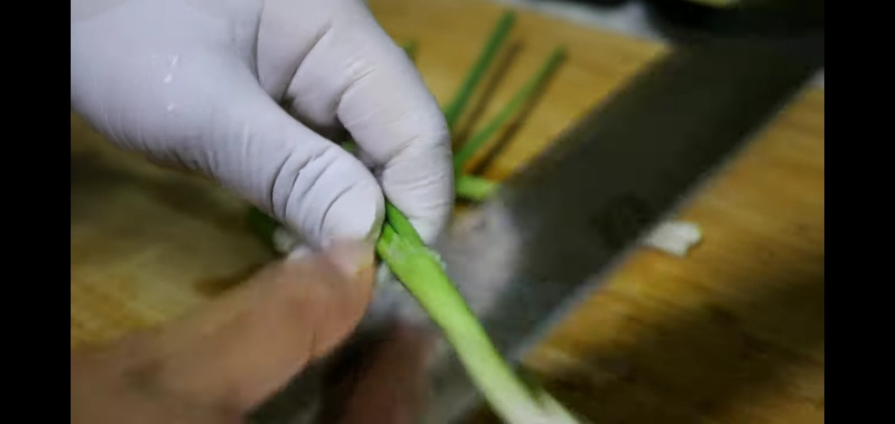 이제 고구마줄기볶음 황금레시피에 들어갈 재료들을 손질해 보겠습니다. 쪽파 20g은 반으로 갈라 먹기 좋은 길이로 잘라 주세요.