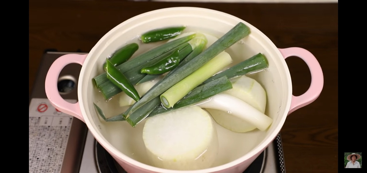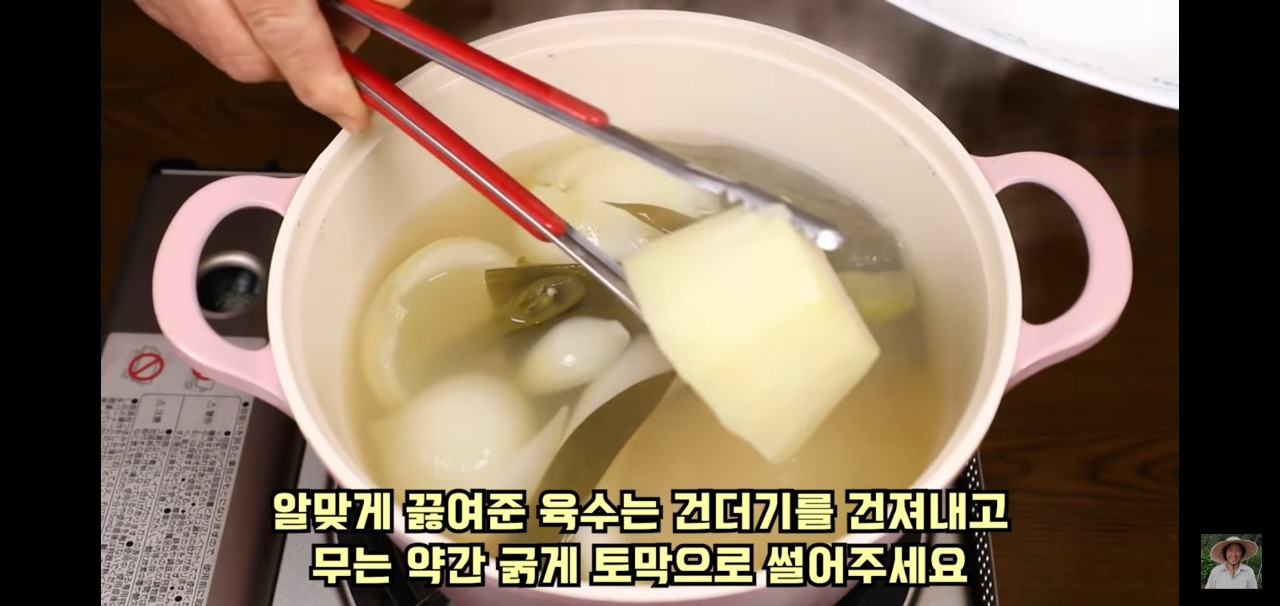 30분 뒤에 다시팩을 건져내고, 추가로 15분 더 끓여 주시면 됩니다. 다 끓인 후에는 무는 따로 건져 작게 썰어 주시고, 나머지 재료들은 건져서 버려 주세요.