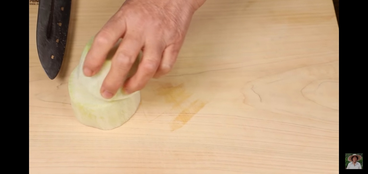 오뎅탕 끓이는 법에 들어갈 재료를 손질해 보겠습니다. 무는 350g 정도 준비해 큼직하게 한 번만 잘라 주시고, 양파도 반으로 갈라 주세요.
