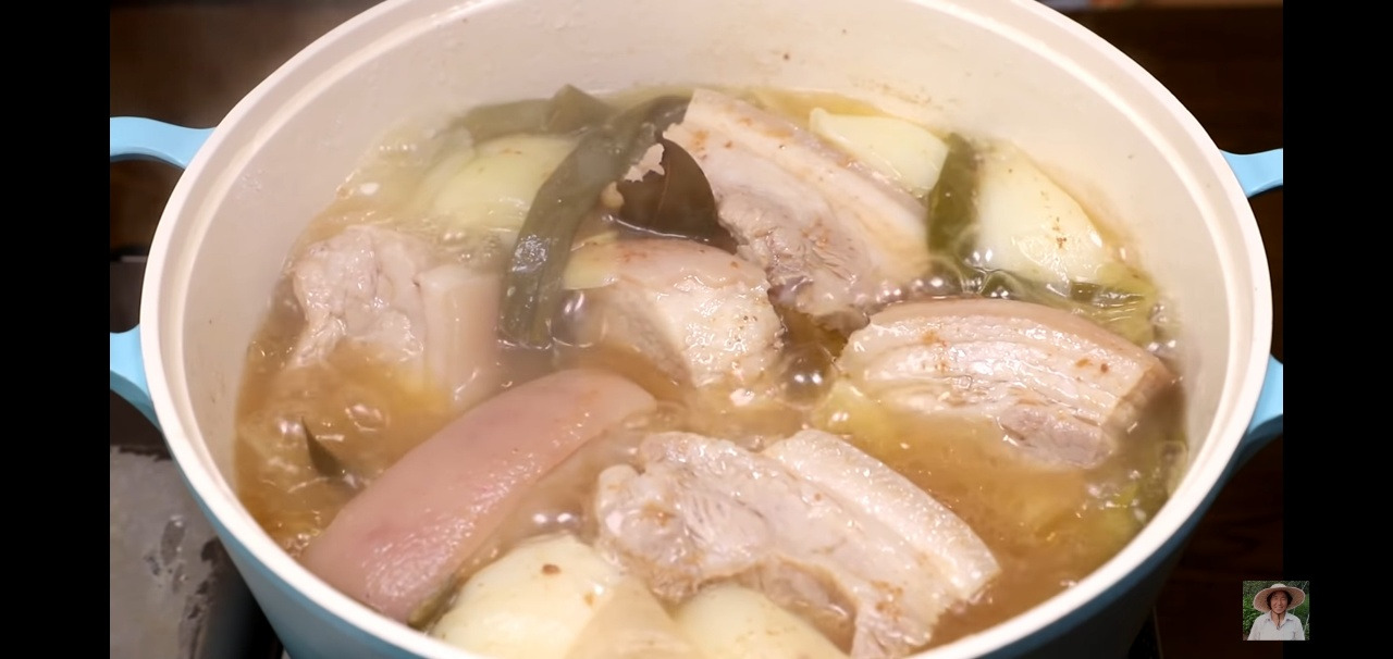수육 삶는 시간은 딱 정해져 있지 않고, 젓가락으로 살코기를 눌렀을 때 부드럽게 푹 들어가면 완성입니다.