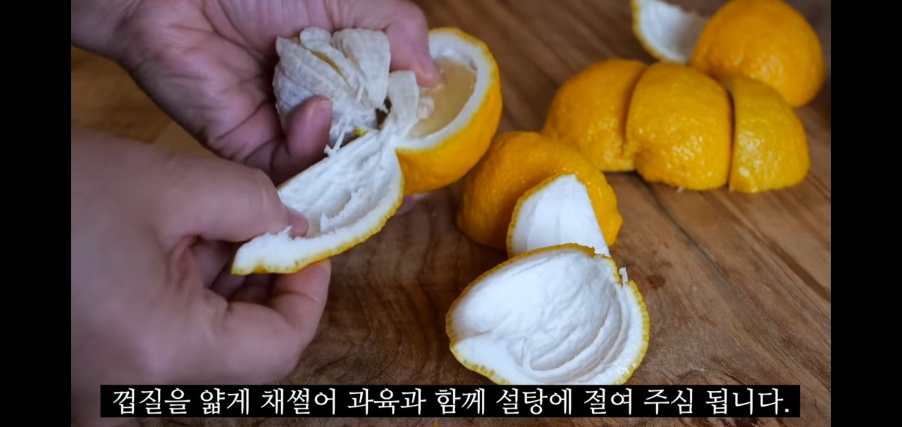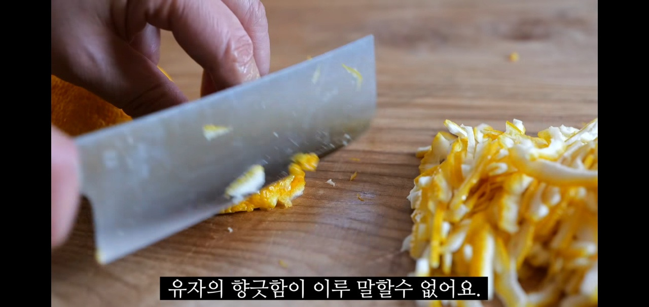 분리해둔 유자 껍질은 얇게 채 썰어 준비해주시면 됩니다.