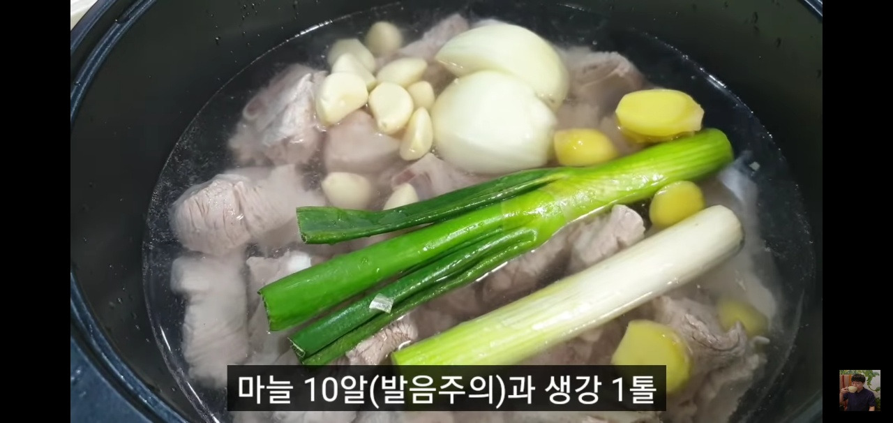 마늘 10알과 생강 한 톨, 청양고추도 함께 넣어 돼지갈비찜 육수를 우려내 주세요.