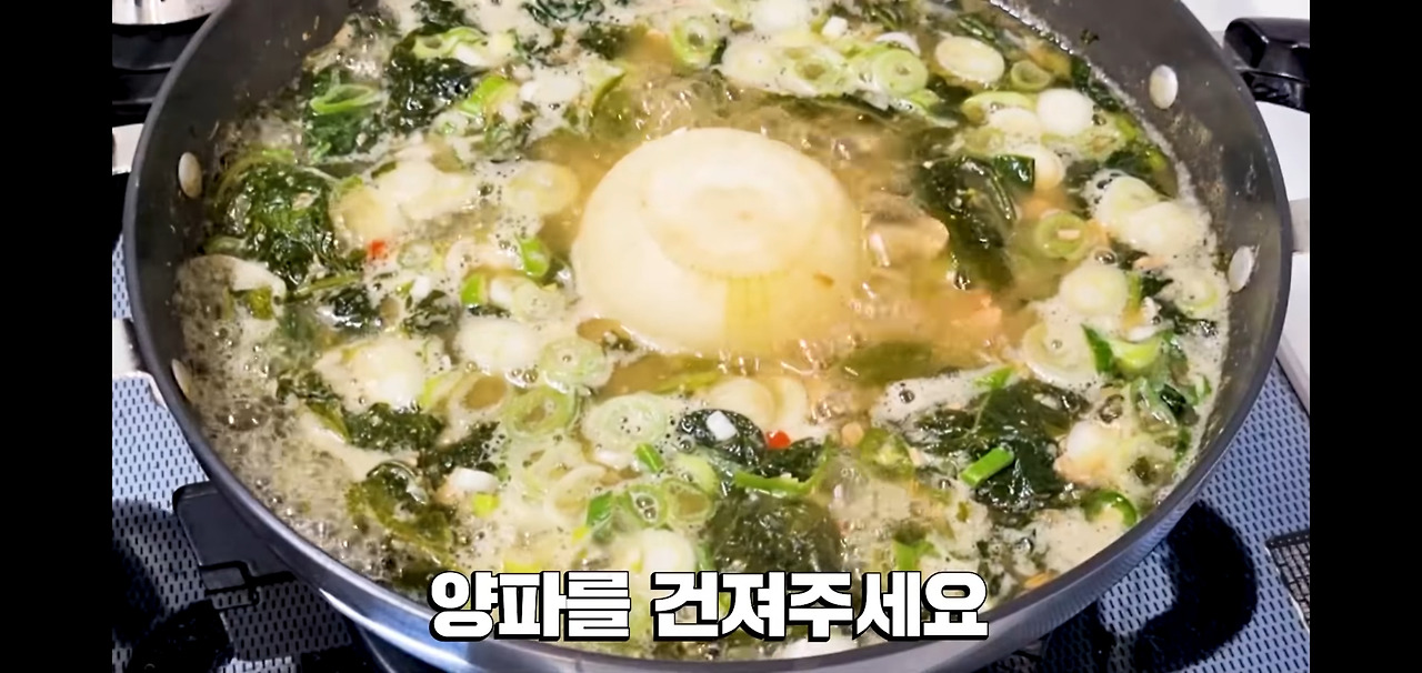 다 끓었다 싶으면 대파를 넣어 마무리해 주세요. 양파는 건져내면 됩니다.