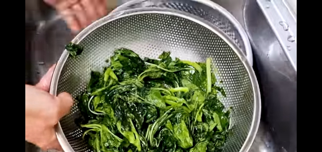 이렇게 깔끔하게 씻은 아욱은 채에 받쳐주세요.
