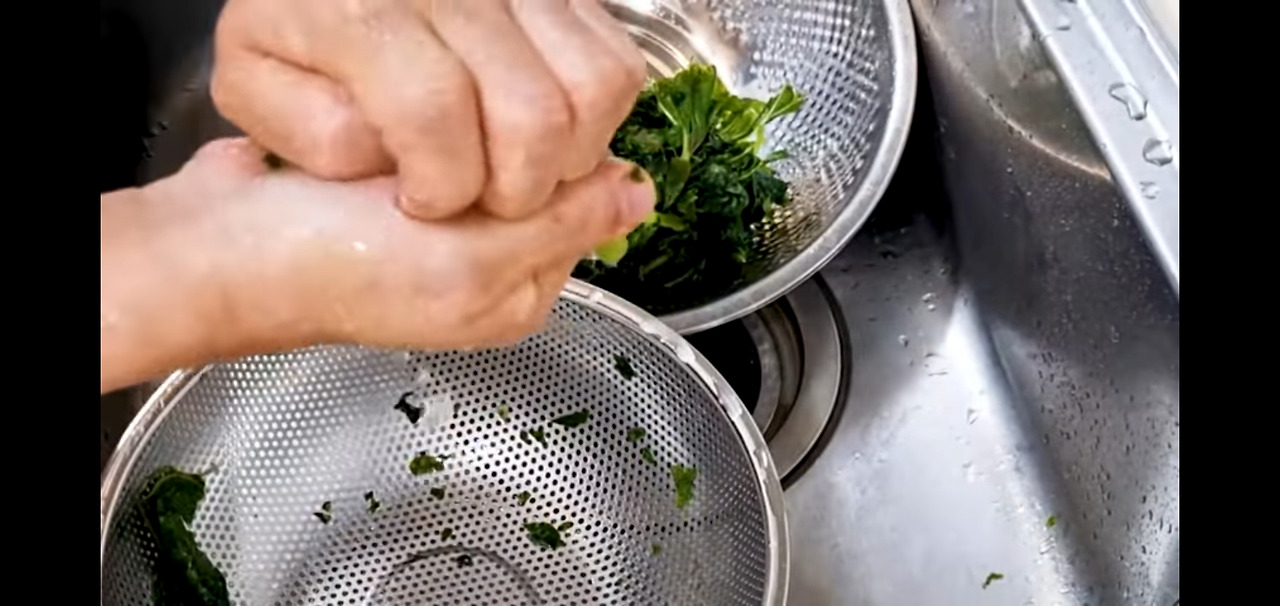 그다음 손으로 아욱의 물기를 꽉 짜서 다시 양푼이에 넣어주세요.