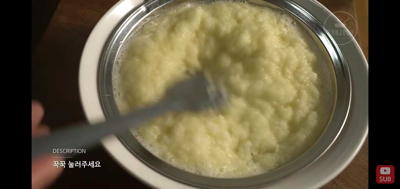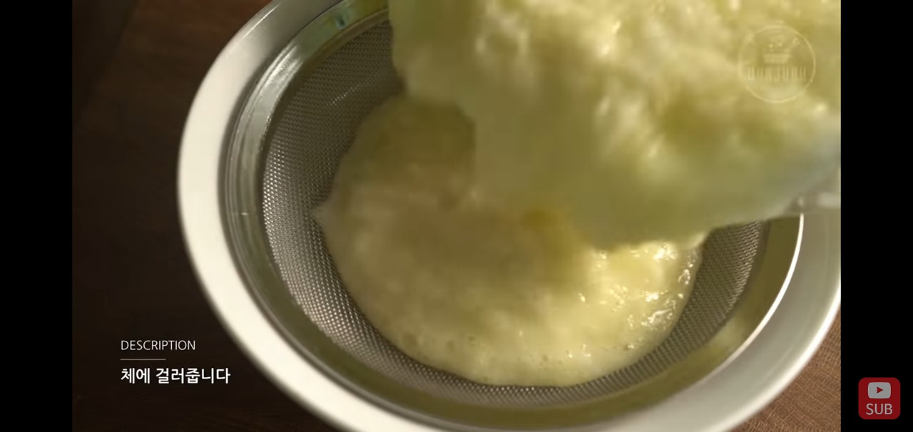 감자를 체에 받쳐 꾹꾹 눌러가며 전분과 물을 빼주세요.