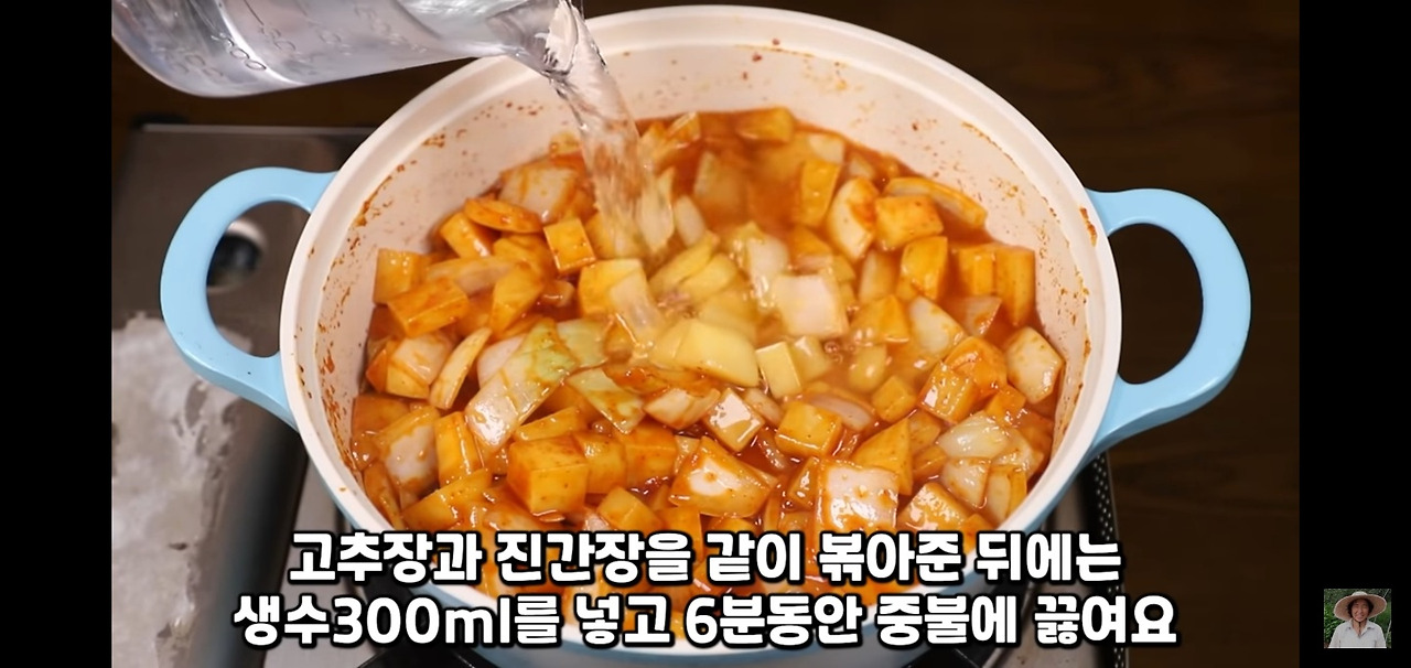 고추장과 간장을 넣고 한 번 섞어 준 뒤 생수 300ml를 넣고 6분 동안 잘 볶아 주세요. 감칠맛이 도는 멸치 육수를 사용하면 더욱 맛있는 감자 짜글이를 즐기실 수 있습니다!