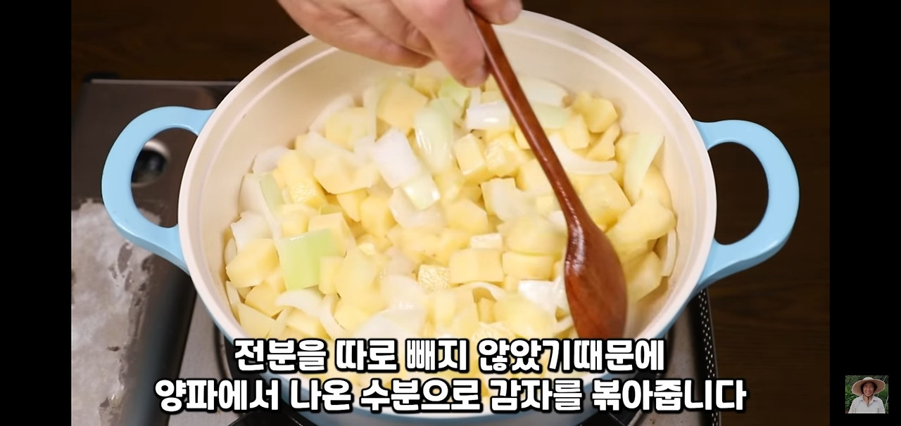양파를 가장 먼저 넣고 1분간 볶아 기름으로 코팅해 주세요. 그다음 감자를 넣고 30초간 볶아주시면 됩니다.