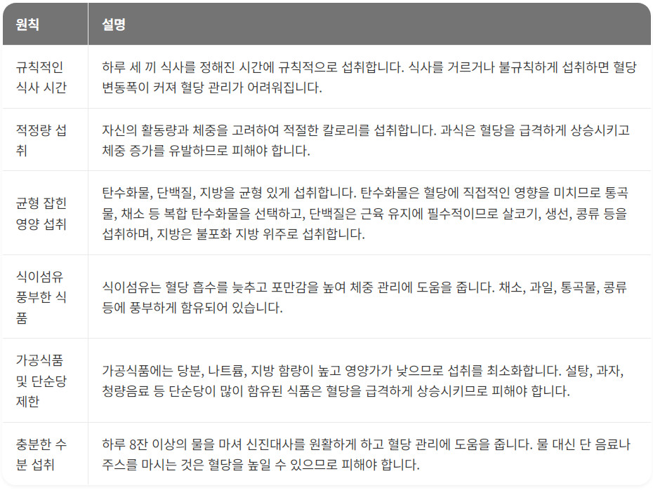 ▶규칙적인 식사 시간: 매일 일정한 시간에 식사하여 혈당 변동 폭을 최소화합니다.