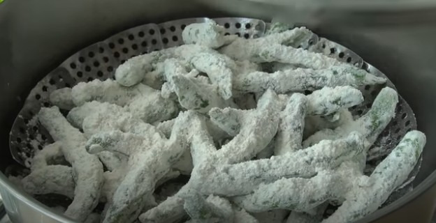 ▶찜기에 물이 끓기 시작하면, 밀가루 옷을 입힌 꽈리고추를 넣고, 남은 밀가루를 위에 고르게 뿌려주세요. 밀가루가 충분히 덮여 있어야 찐 후에도 밀가루 옷이 잘 유지됩니다.
