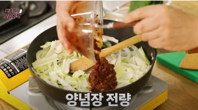 ▶ 먼저 양파를 넣고 볶다가, 양배추와 대파도 함께 넣어 볶아줍니다.