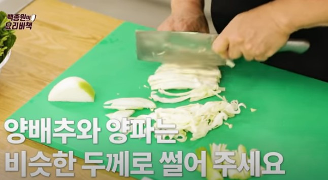 ▶ 대파는 반으로 갈라 5~6cm 길이로 썰어주시고, 양배추와 양파는 비슷한 두께로 썰어주세요.