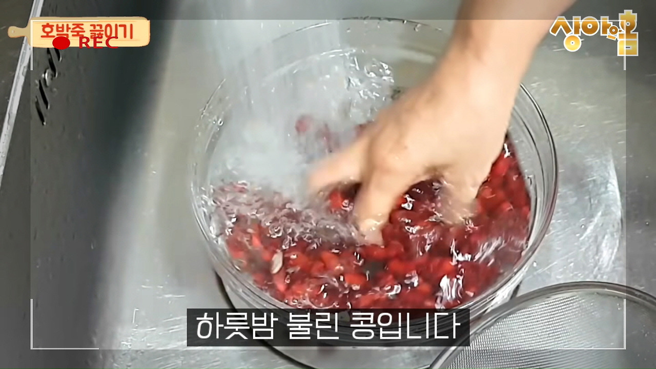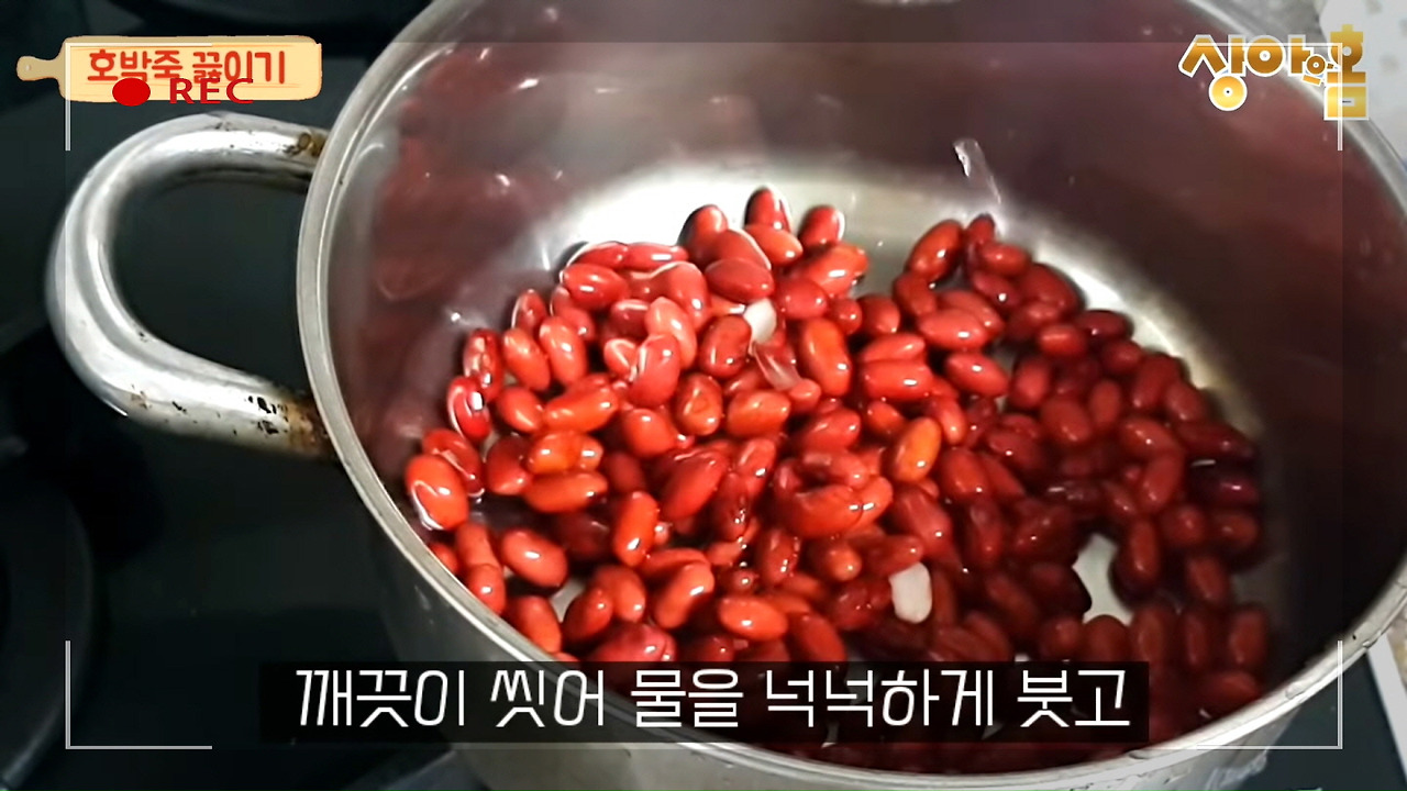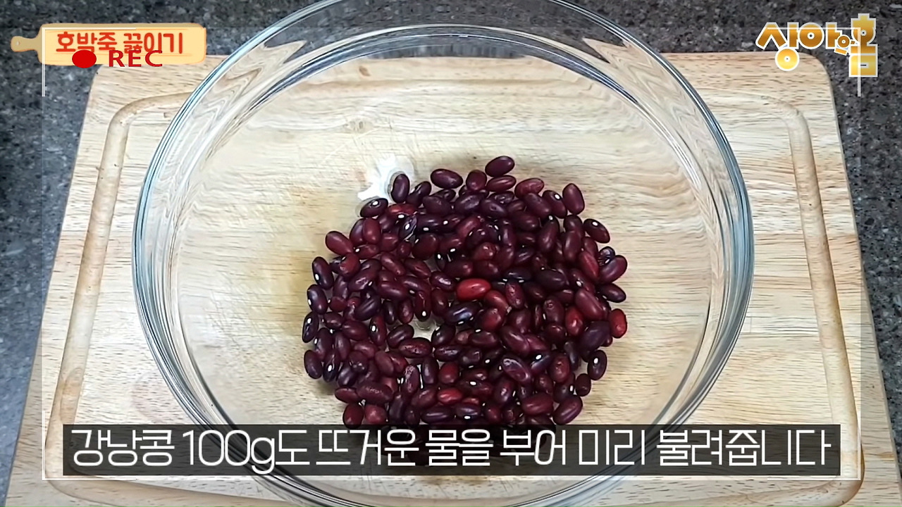 먼저 강낭콩을 불려야 합니다. 강낭콩 100g에 뜨거운 물을 부어 충분히 불려주시면 준비가 완료됩니다.