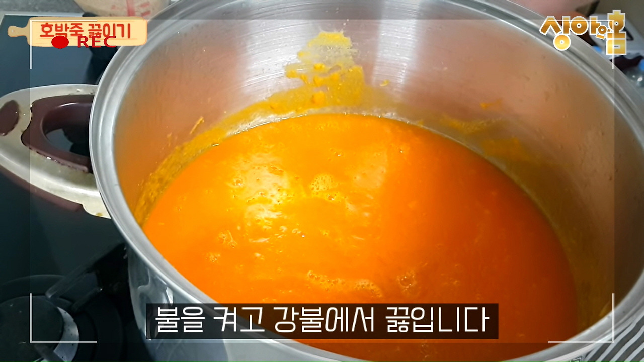 이제 본격적으로 호박죽을 완성하는 마지막 단계를 살펴보겠습니다. 여기까지 오셨다면 거의 다 완성된 것이나 다름없습니다. 갈아둔 호박을 강한 불에서 끓이다가 끓기 시작하면 불을 중불로 줄여주세요.