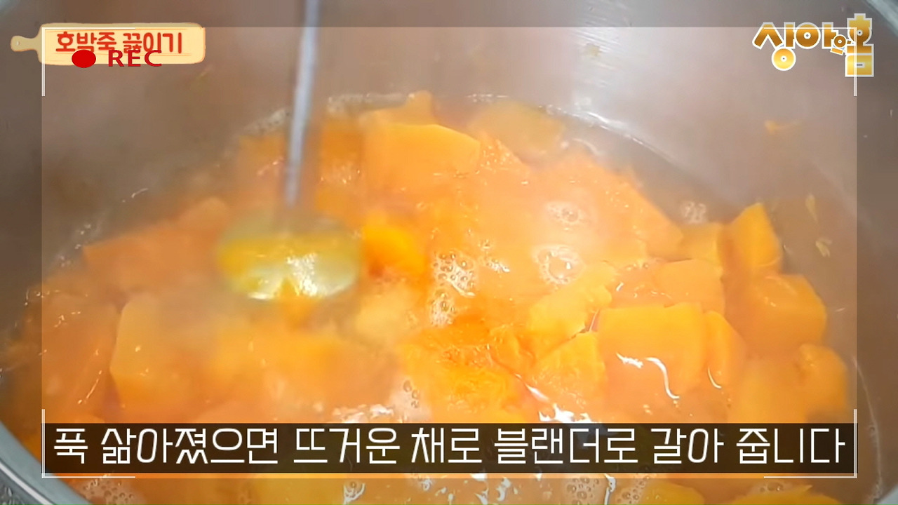 푹 익은 호박은 뜨거운 상태에서 곱게 갈아주세요. 핸드 블렌더나 믹서기를 사용하시면 편리합니다. 달콤하면서도 고소하고 부드러운 풍미가 살아나도록 곱게 갈아주시면 됩니다.