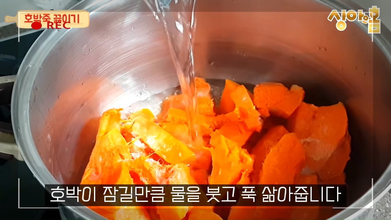 이제 호박죽을 끓이기 위해 호박을 곱게 갈 준비를 해야 합니다. 호박이 충분히 잠길 만큼 물을 붓고, 약 30분 동안 푹 삶아주세요.