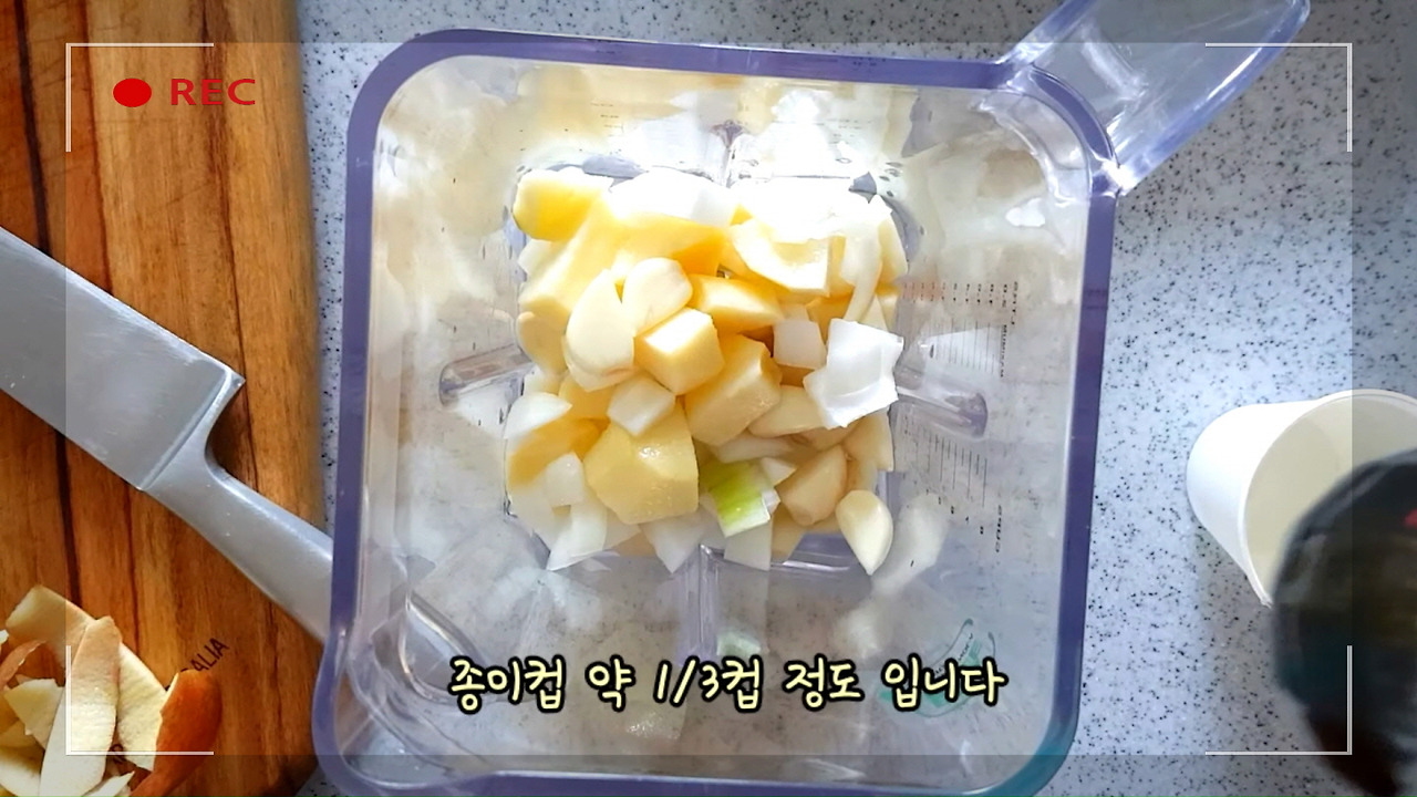 떡볶이 소스의 맛을 한층 더 풍부하게 해줄 야채 즙을 준비할 차례입니다. 야채 즙을 사용하면 떡볶이의 깊은 맛과 감칠맛을 더욱 끌어올릴 수 있습니다. 야채 즙에 들어갈 사과는 껍질을 벗긴 뒤 믹서기에 곱게 갈아주세요.