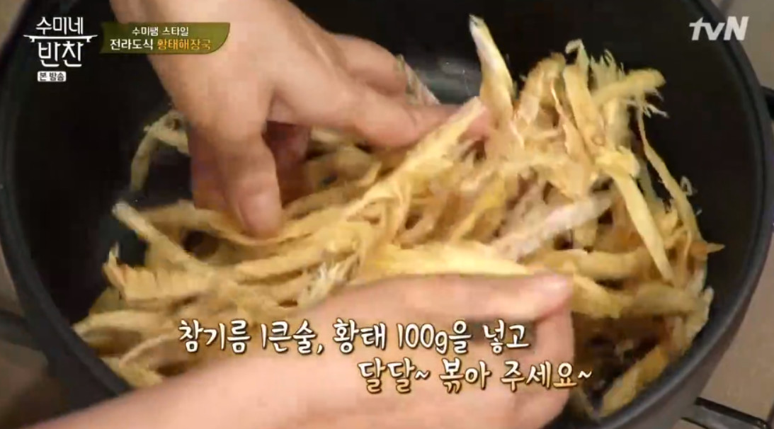 약한 불로 달군 프라이팬에 참기름 1큰술을 두른 뒤, 황태 100g을 넣고 고소하게 달달 볶아주세요.