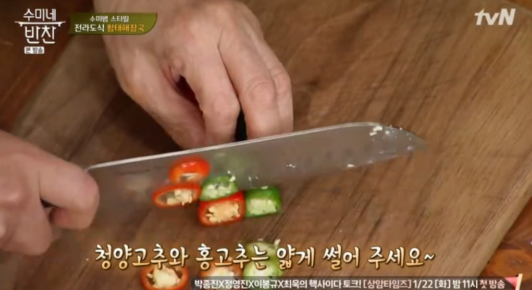청양고추와 홍고추도 곱게 얇게 썰어 준비해 주세요.