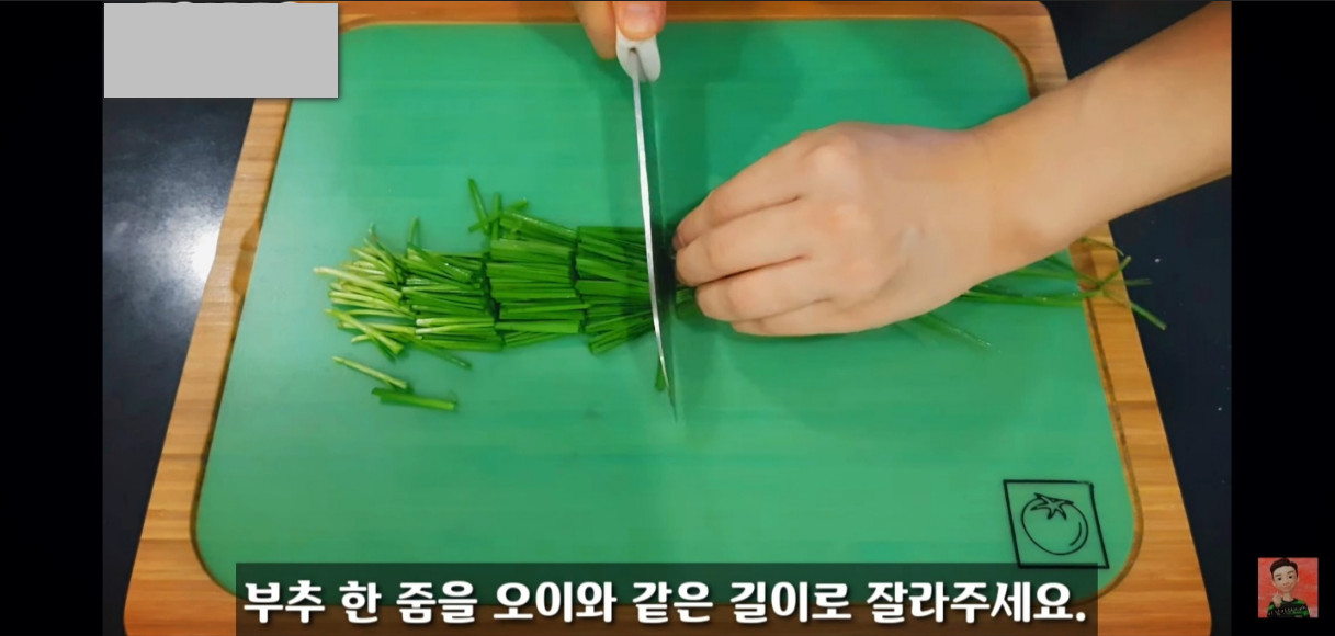 싱싱한 부추 한 줌을 준비해 오이 크기에 맞춰 잘라주세요. 너무 잘게 자르면 집기 불편하고, 너무 크게 자르면 오이무침이 지저분해 보일 수 있으니 오이와 비슷한 크기로 썰어주는 것이 가장 적당합니다!