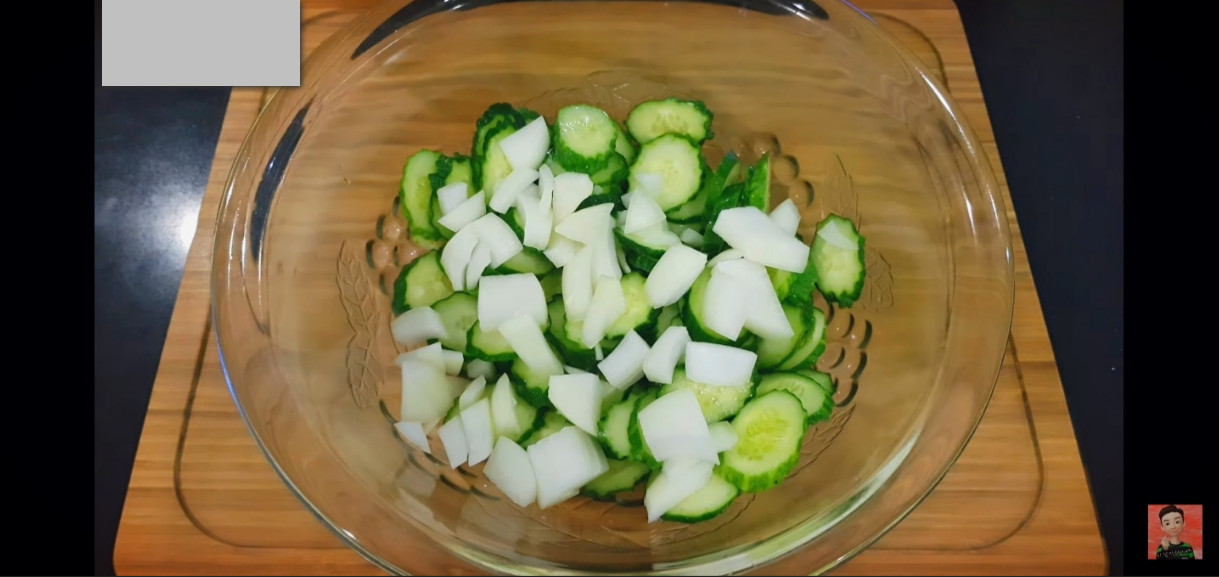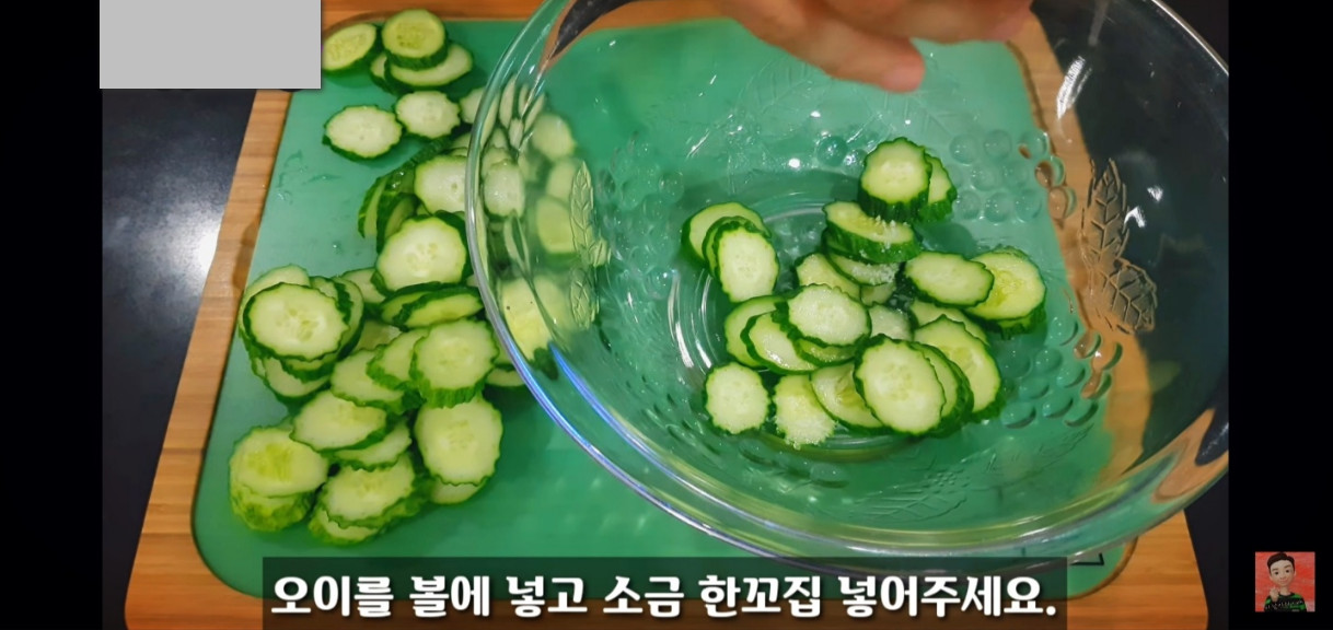 썰어놓은 오이를 그릇에 담고 소금 반 스푼을 넣어 고루 섞어주세요. 오이가 절여지며 간이 스며드는 동안 다른 재료들을 준비하시면 됩니다.