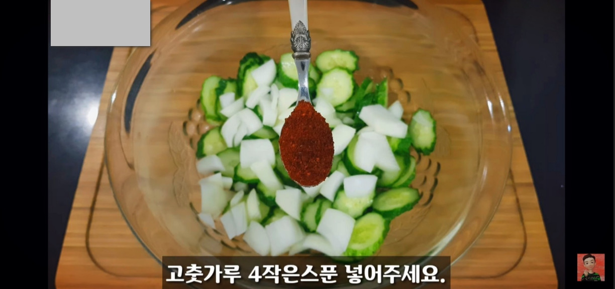 절여둔 오이의 물기를 빼낸 뒤, 양파와 고춧가루 4스푼을 넣어 칼칼한 맛을 더해 주세요.
