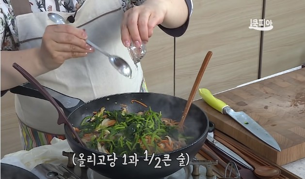 고기가 익으면 데친 시금치를 넣고 올리고당 1과 1/2큰술을 추가해주세요. 모든 재료가 고루 섞이도록 잘 볶아주시면 됩니다.
