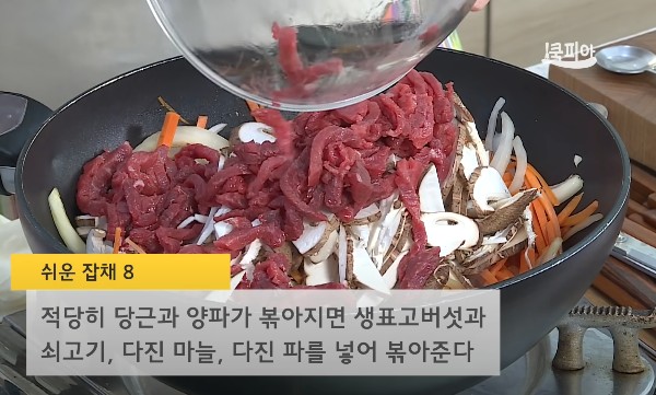 양파와 당근이 어느 정도 볶아지면, 표고버섯과 소고기를 넣고 다진 마늘 1큰술, 다진 파 1큰술을 함께 넣어주세요. 여기에 간장 3큰술을 더해 볶아줍니다. 시금치는 고기가 익은 뒤에 넣어야 색이 변하지 않으니 주의해주세요. 또 당면도 중간중간 고루 저어가며 볶아주시면 됩니다.